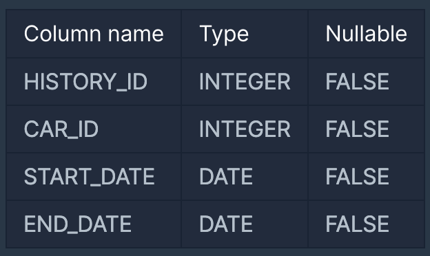 CAR_RENTAL_COMPANY_RENTAL_HISTORY 테이블은 아래와 같은 구조로 되어있으며, HISTORY_ID, CAR_ID, START_DATE, END_DATE 는 각각 자동차 대여 기록 ID, 자동차 ID, 대여 시작일, 대여 종료일을 나타냅니다.