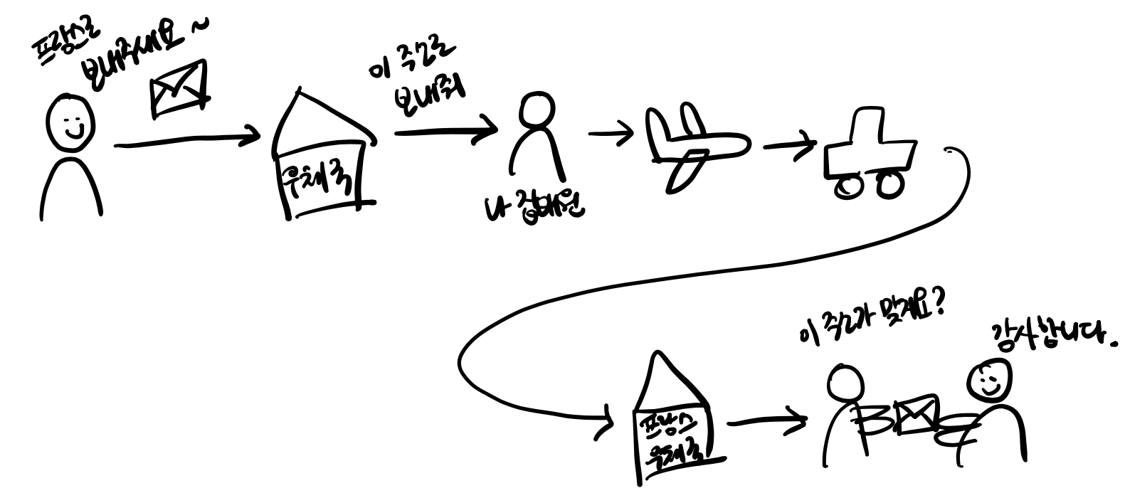 한국에 있는 내가 프랑스에 있는 친구에게 우편으로 편지를 보내는 상황을 상상해보자!