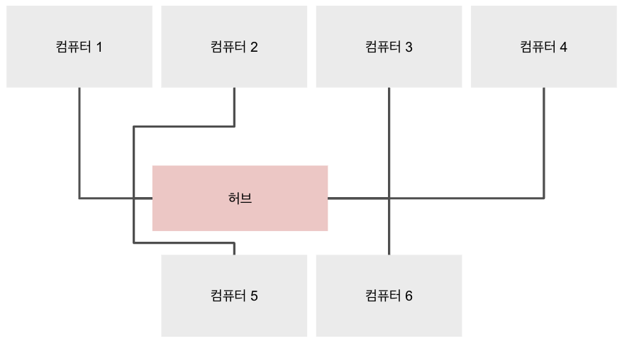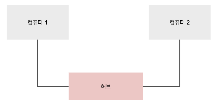 옛날에는 서로 다른 두 대의 컴퓨터를 가지고 데이터를 공유하기 위해서는 물리적인 연결이 필요했다. 어떠한 연결선을 내 컴퓨터에 연결하고 '허브'라고 불리었던 네모난 장치에 같이 연결해야 했다. 그림으로 표현하자면 다음과 같다.