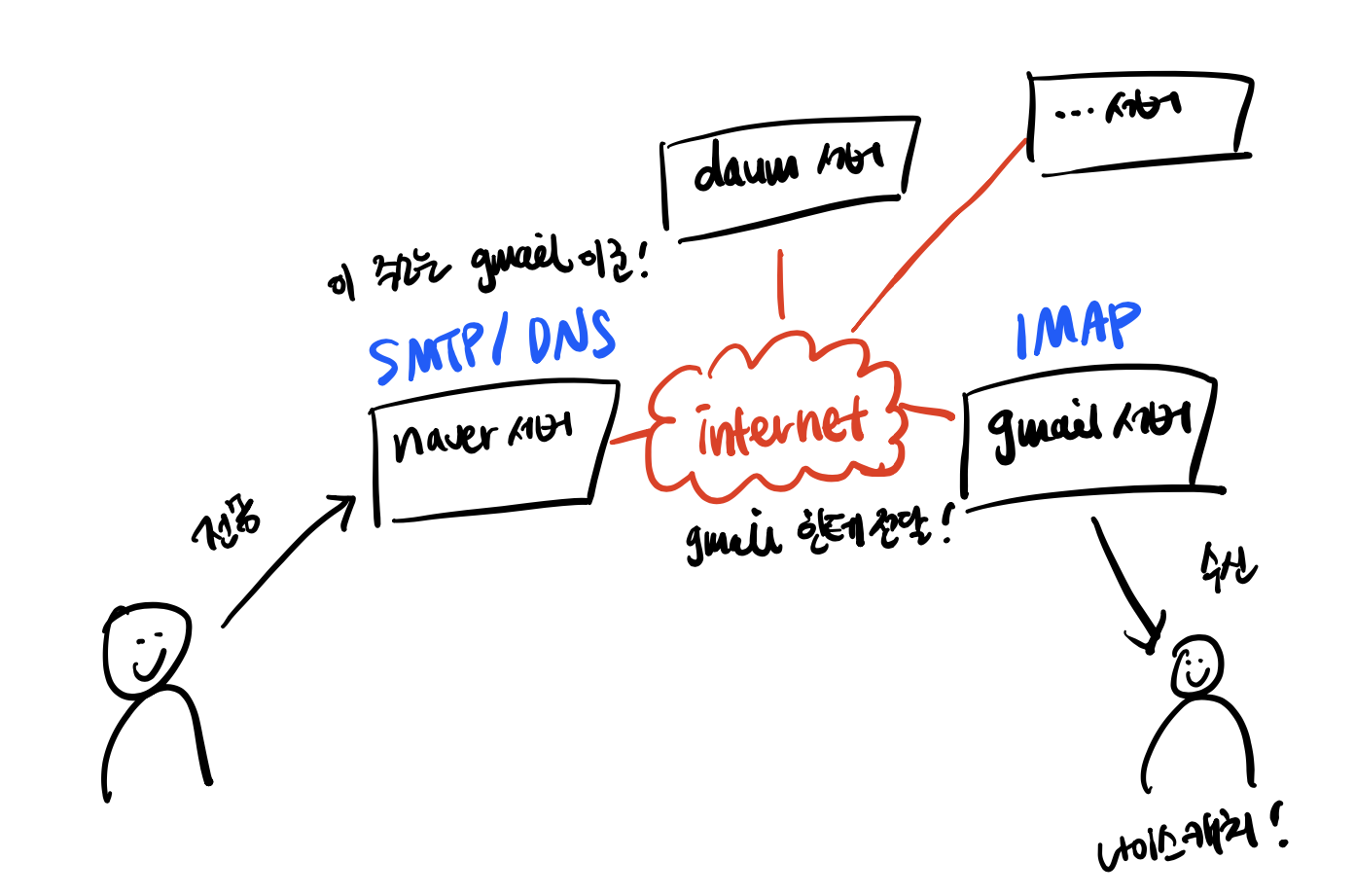 naver 메일을 이용하여 이메일을 작성하고 보내면 naver 메일 서버는 SMTP 프로토콜 + DNS(Domain Name System) 프로토콜을 통해 친구의 메일 서버 주소를 확인하고 gmail 메일 서버로 전송한다. gmail 메일 서버는 IMAP 프로토콜을 사용하여 메세지를 받고 저장한다.