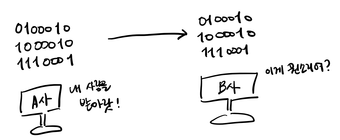 컴퓨터는 모든 입력을 0과 1로만 이루어진 디지털 언어만 사용한다. 해석하는데 서로 다른 규칙이 있다면, 당연히 다양한 제조사의 컴퓨터들이 위 그림처럼 데이터를 해석하지 못하는 상황이 나타난다. 이를 해결하기 위해 표준화된 통신 규칙, 즉 프로토콜이 필요했다.