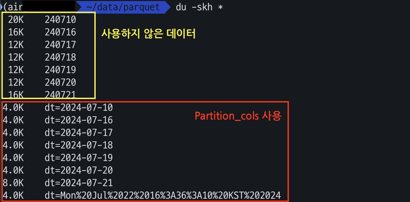 아래는 실제로 partition_cols을 사용하여 저장한 데이터와 그렇지 않은 데이터의 용량 크기 차이를 보여준다.