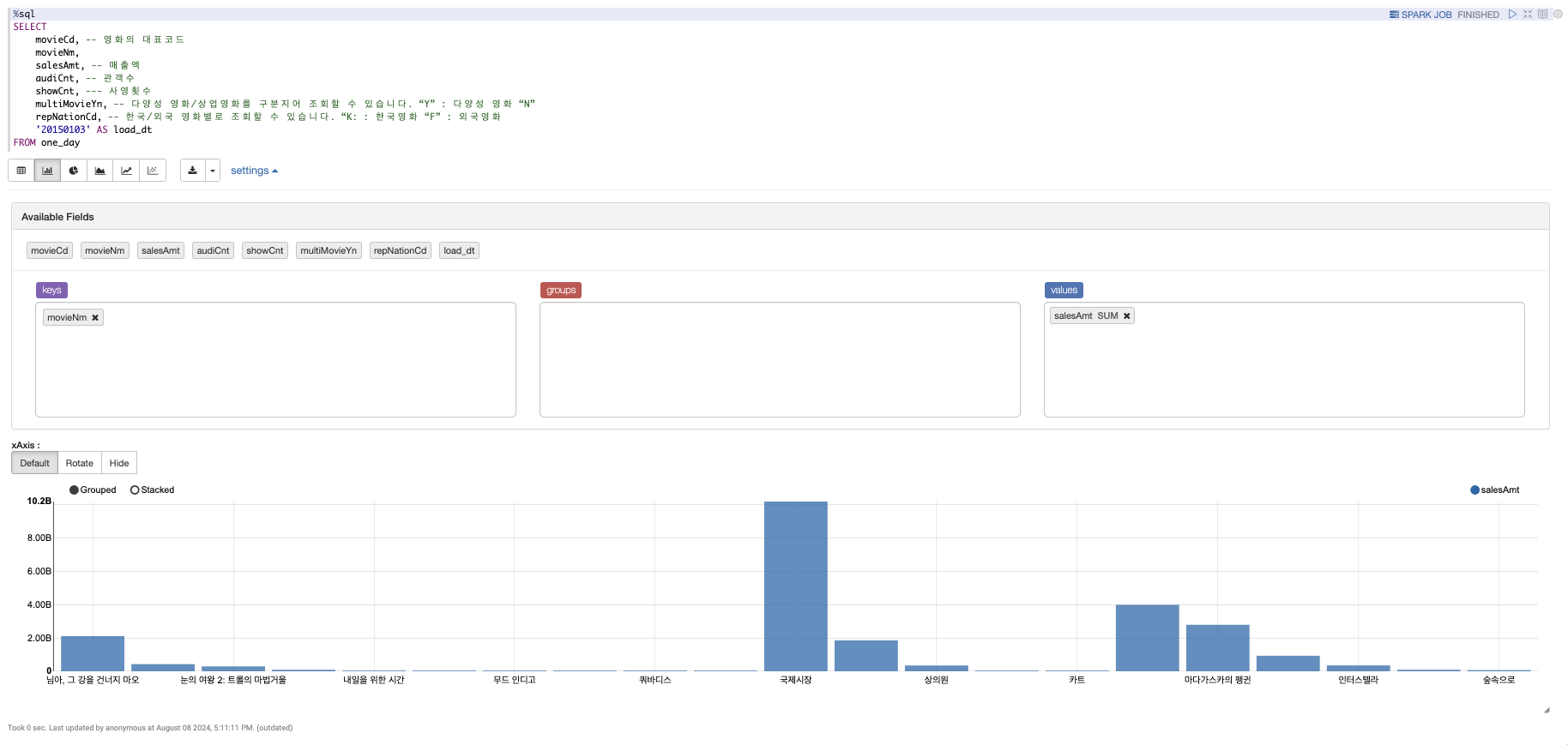 참고로 spark.sql을 작성할 때 수시로 테이블을 확인하고 싶다면 zeppelin에서 확인하면 된다. 게다가 스파크는 데이터 시각화도 간단하게 구현할 수 있다. 아래처럼 컬럼들을 올바른 위치에 옮겨주면 된다. 판다스보다 훨씬 간편해서 좋았다.(팀프로젝트에서 판다스로 데이터 시각화하는데 어려움을 겪은 경험이 있기에....)