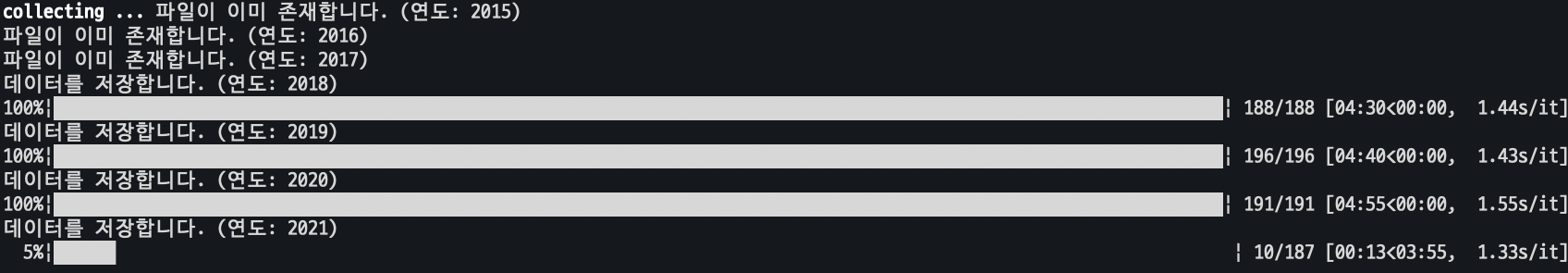 - tqdm(range(1, total_pages + 1))는 현재 페이지 진행 상황을 시각적으로 표현 (아래는 tqdm을 사용한 기능)
