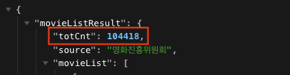 - tot_cnt는 해당 연도의 총 영화 개수이다. (아래는 영화진흥위원회에서 제공하는 JSON파일 이미지캡쳐본)