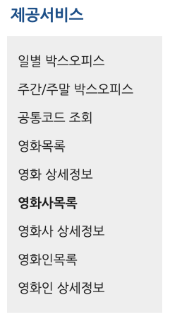영화진흥위원회에서 제공하는 영화데이터가 아래와 같이 다양하게 있다.