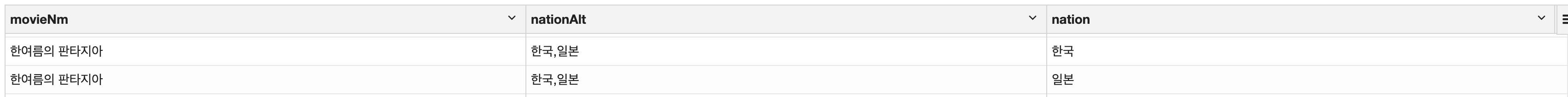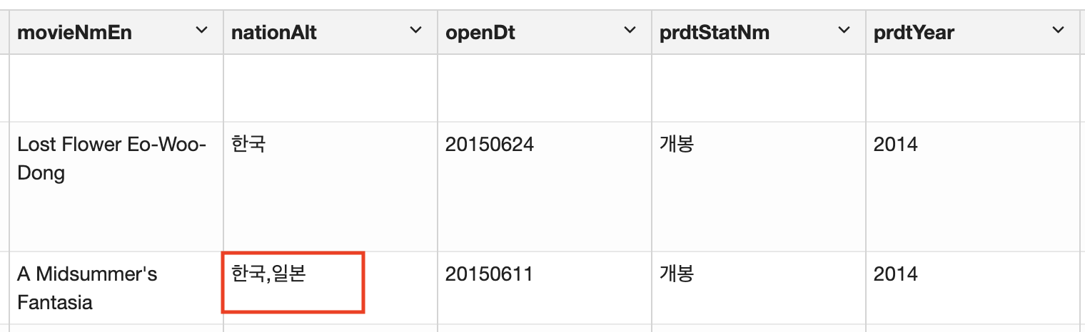 위 사진을 보면 nationAlt 는 string타입인데 2개의 국가가 표시되어있는 영화도 있다.