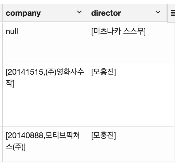 위 테이블에서 마지막 영화는 Array타입인 companys 컬럼에 영화사가 2개이다.