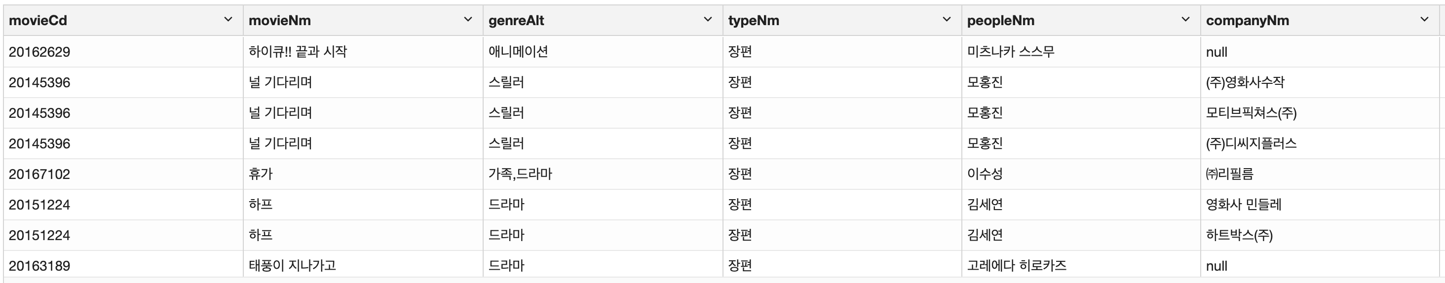 sdf = eedf.select("movieCd", "movieNm", "genreAlt", "typeNm", "director.peopleNm", "company.companyNm")
