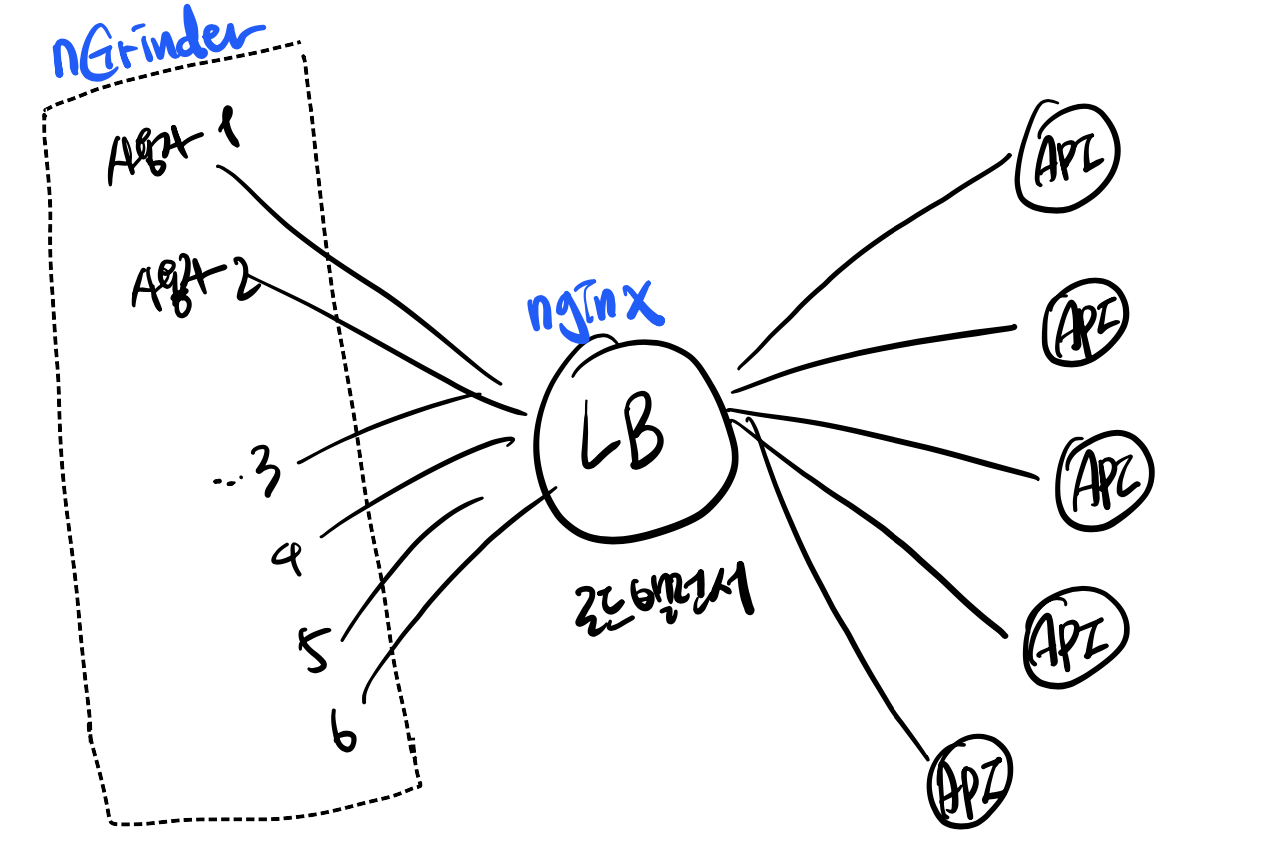 사용자들은 nGrinder를 이용해 Virtual user로 세팅할 것이며, nginx를 이용한 로드밸런서가 사용자들을 분산하여 한쪽 서버에만 과부하되지 않게 처리한다.