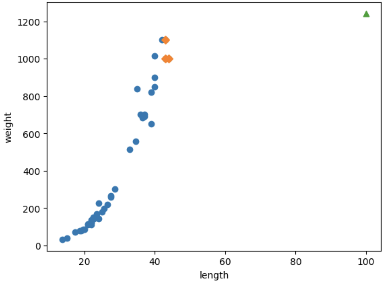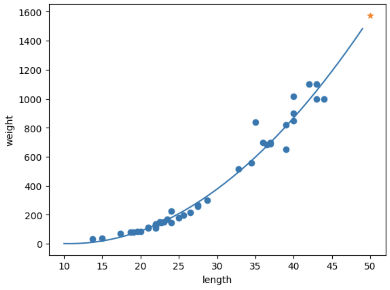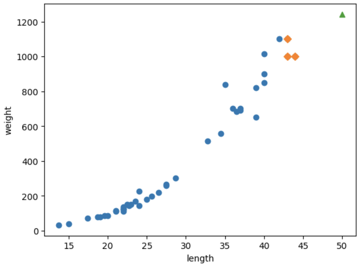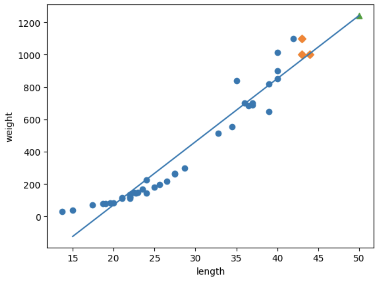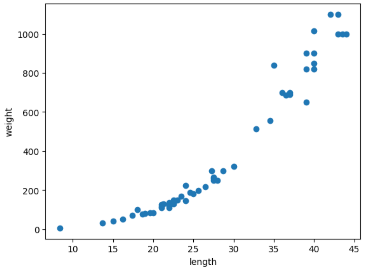 농어의 길이를 입력하면 무게를 예측해주는 회귀모델을 구현해보자.