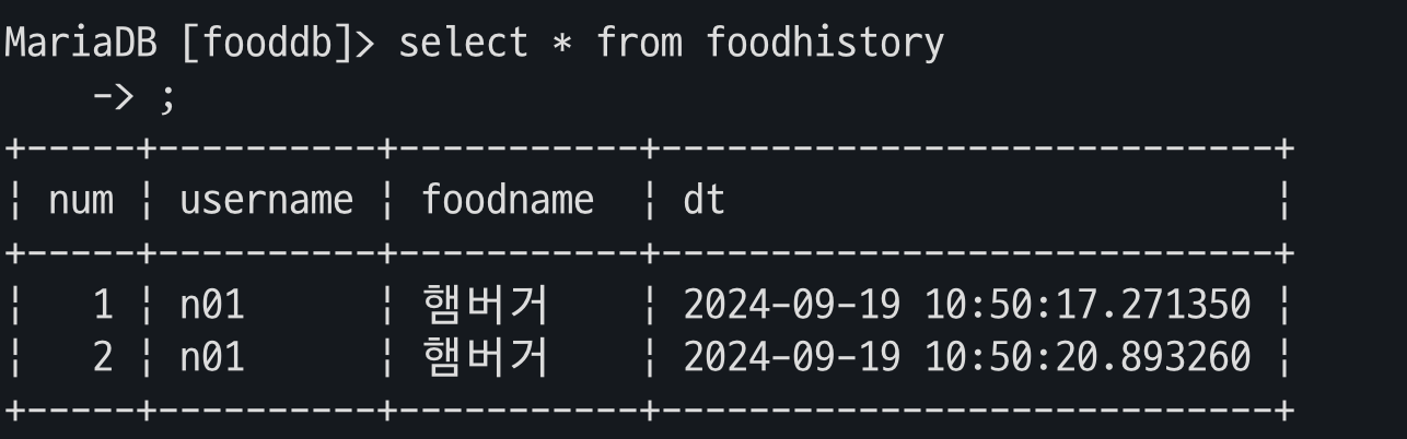 db에서 확인해보니, fooddb 라는 데이터베이스에 foodhistory 라는 테이블이 있고 구조는 다음과 같다.