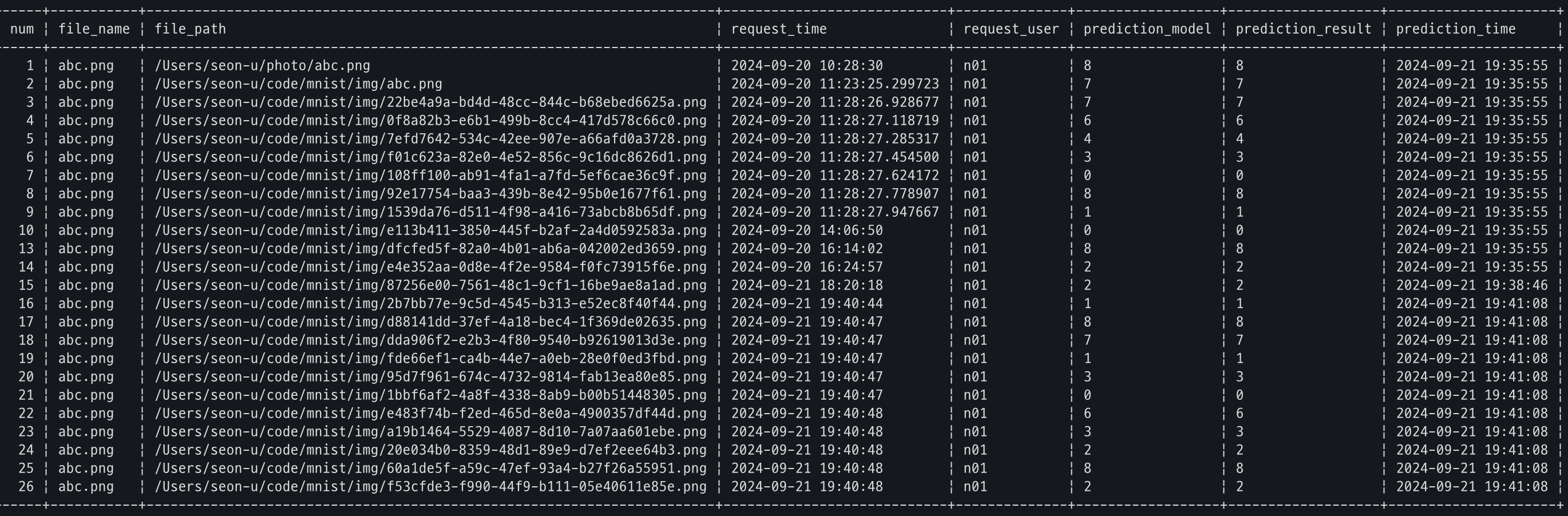 # RANDOM 으로 0 ~ 9 중 하나 값을 prediction_result 컬럼에 업데이트