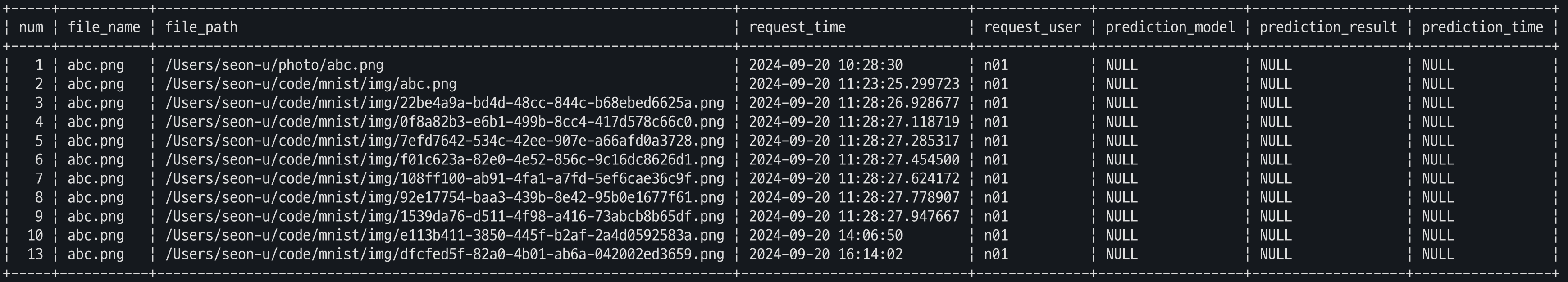 sql = "INSERT INTO image_processing(`file_name`, `file_path`, `request_time`, `request_user`) VALUES(%s,%s,%s,%s)"