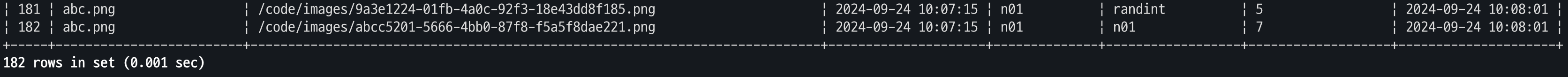 sql = "INSERT INTO image_processing(`file_name`, `label`, `file_path`, `request_time`, `request_user`) VALUES(%s,%s,%s,%s,%s)"