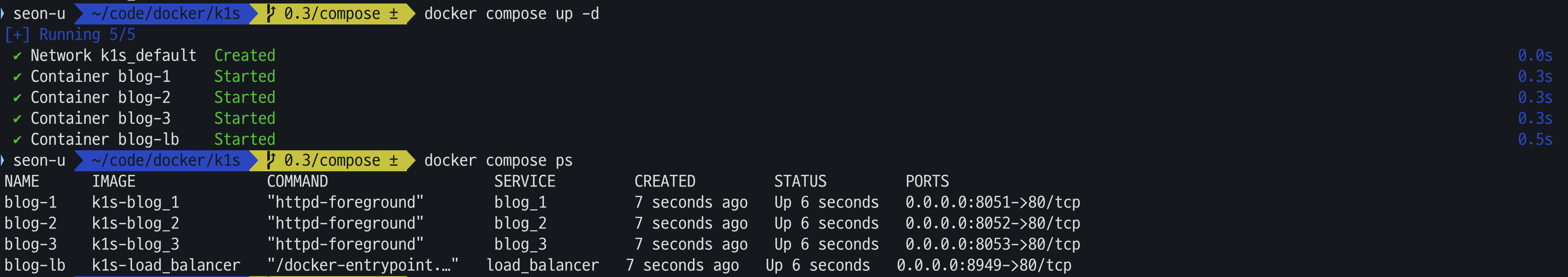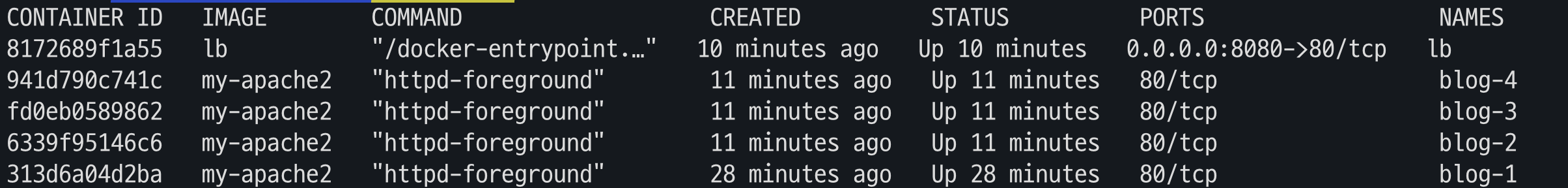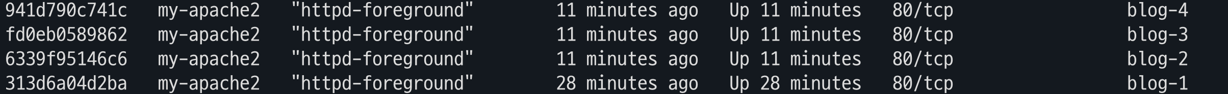 나는 컨테이너들을 blog-1 / blog-2 / blog-3 / blog-4 으로 총 3개를 만들었고 포트번호는 주지않았다.